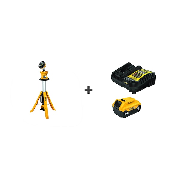 Tripod Light Kit, Battery Platform 20V MAX*, Series 20V MAX*, Light Output Mode High, Low, Medium, Brightness Level 3,000 lm, Maximum Brightness Level 3,000 lm, Minimum Brightness Level 0 lm, Mount Type Tripod, Maximum Height 88 in, Minimum Height 10 1/8 in, Light Distribution 180 Degrees , Head Type Rotating, Maximum Head Rotation Angle 360 Degrees , Cordless Tool Kit Contents (1) Bare Tool, (1) Battery, (1) Charger, Battery Capacity (1) 5.0 Ah, Run Time 11 hr, Voltage 20V DC