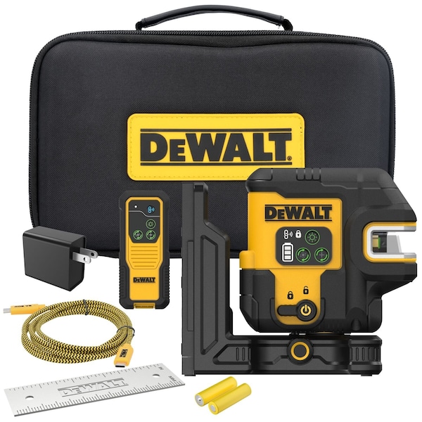 Dot Laser, Accuracy +/-1/8 in @ 33 ft, Battery Type AA, Features Compact Design, Fine Adjustment Knob, Remote-control Functionality - Maintain Productivity with Remote Control On/Off Functionality and Beam Brightness Adjustments with upto 330 ft Remote Control Range with Included DCLEAUSBRC2 Remote Control, Includes Cable and Charger Compatible with USB-C Cables and Connectors, Remote Control, Mounting Plate, Power Adapter, Storage Case, Number of Planes Not Applicable, Number of Dots 2