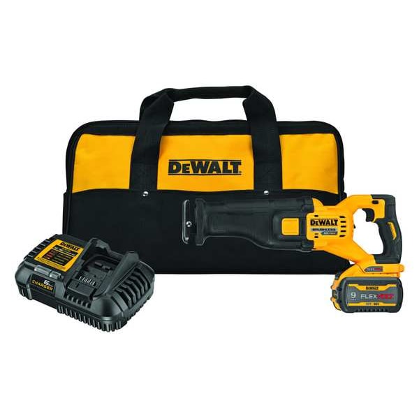 The DEWALT DCS389X1 FLEXVOLT® 60V MAX* Brushless Cordless Reciprocating Saw Kit is a cordless cutting tool designed for general purpose applications. Powered by a high-capacity 9.0Ah FLEXVOLT® lithium-ion battery, this saw is rated for increased power output relative to prior DEWALT reciprocating saw models, per manufacturer specifications and offers the performance of a corded tool with the convenience of cordless operation. The kit includes one battery, charger, and a storage bag for portability.