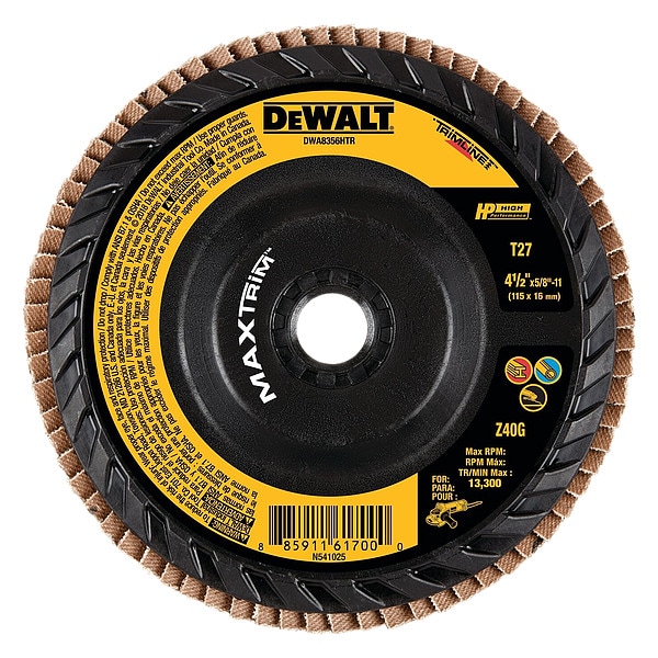 Flap Disc, Abrasive Type Coated, Abrasive Material Zirconia Alumina, Grade Coarse, Backing Plate Material Plastic, Connector Size 5/8 In.-11, Connector Type Threaded Hole, Density Rating High, Flap Disc Type Type 27, Overall Diameter 4 1/2 in, Series HP MAXTRIM, Backing Material Cotton/Polyester, Backing Weight YF, Grit 40, Maximum Operating Speed 13,300 RPM, Features Trimmable