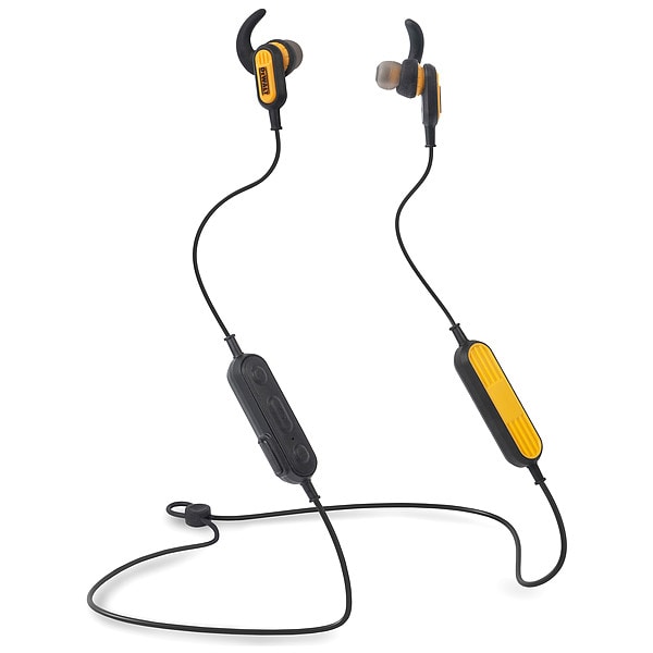 Jobsite Wireless Earphones, Material Plastic, Metal, Resistance Properties Water Resistant, Features Bluetooth 5.0, Color Black, Yellow, Product Type Wireless Earbud, For Use With Cell Phones, Computers, Tablets, Includes Ear Cushions, Micro-USB Charging Cable, Shirt Clip