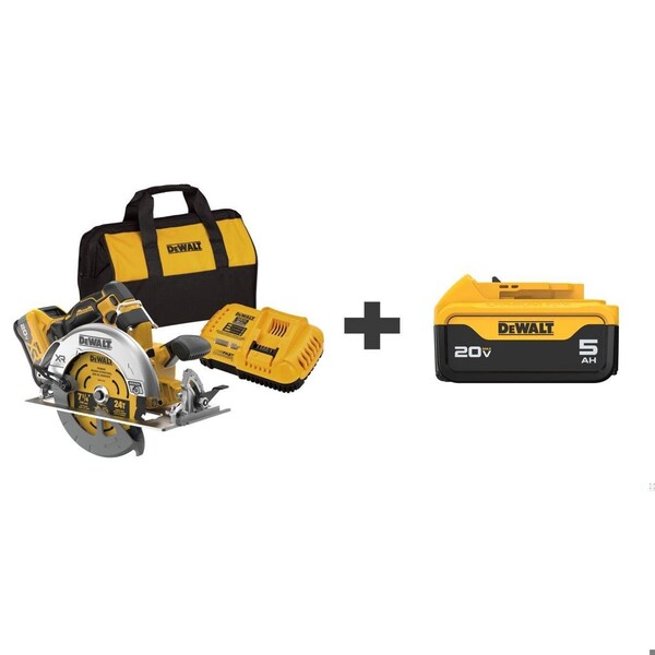 (1) 20V MAX* XR Brushless 7-1/4 in. Circular Saw, (1) 7-1/4 in. 24T Blade, (1) Blade Change Wrench, (1) DCB118 Charger, (1) DCB205, (1) DCB2108 20V MAX* XR POWERPACK 8 Ah Battery, (1) Kit Bag