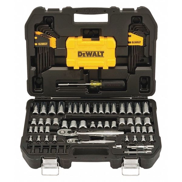 The DEWALT DWMT73801 Mechanics Tool Kit is a 108-piece set suitable for a variety of mechanical applications, packaged in a durable case for organized storage and transport. This kit includes both 1/4 in. and 3/8 in. drive sizes, with an assortment of sockets, ratchets, extensions, adapters, hex keys, nut driver bits, and a vinyl grip multi-driver to accommodate metric and SAE measurement types.