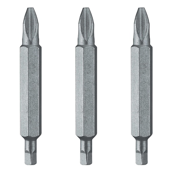 Insert Bit, Application - Tools Power, Bit Style Phillips, Fastening Tool Tip Size #2/#2, Shank Style Hex Power Drive, Hex Shank Size 1/4 In., Double End, Fastening Tool Material S2 Steel, Overall Bit Length 2 In., SAE, Finish Zinc Phosphate, Impact Rated No, For Use With Drill/Driver, Impact Driver, Package Quantity 3