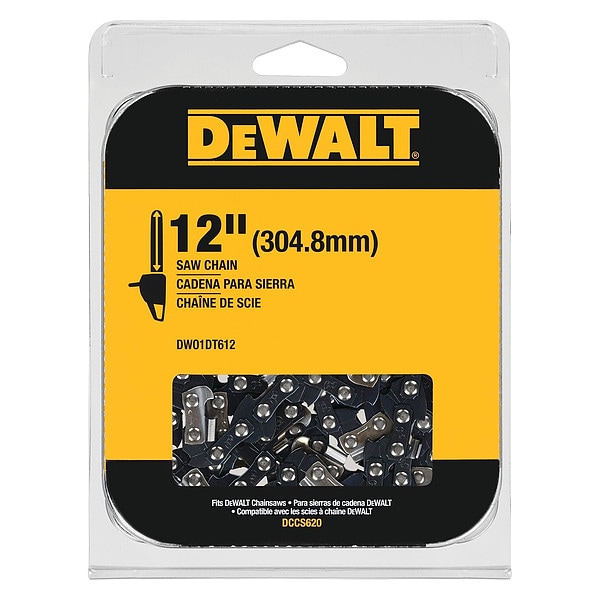 The DEWALT DWO1DT612 Replacement Chain is a 12-inch chainsaw chain compatible with DEWALT’s 20V MAX* Cordless Chainsaw (DCCS620). This replacement chain provides low vibration during operation and is intended to provide smooth cutting and reduce kickback.