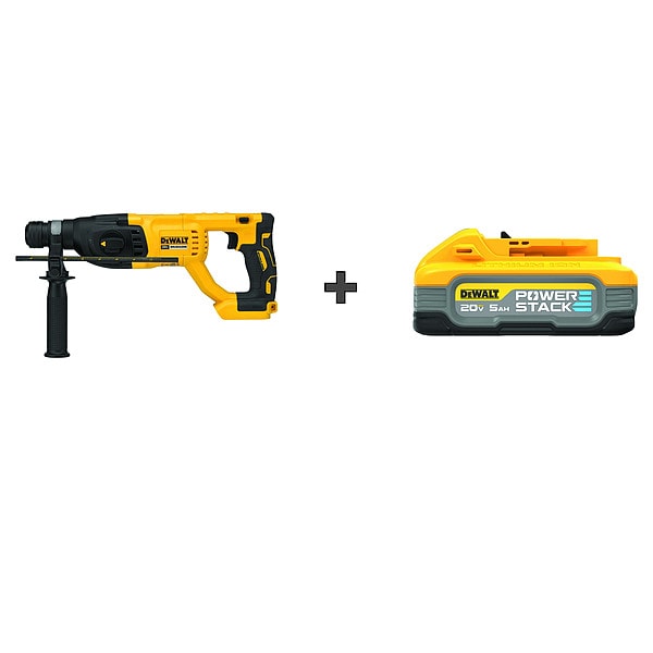 Rotary Hammer, Voltage 20V DC, Chuck Style SDS-Plus, Solid Bit Optimal Drilling Range in Concrete 3/16 in to 5/8 in, Core Bit Capacity in Concrete 1/2 in, Blows per Minute 0 bpm to 5,500 bpm, Anti-Kickback Clutch Yes, Modes of Operation Drill, Hammer Drill, or Chip, Brushless Motor Yes, Cordless Tool Kit Contents (1) Bare Tool, (1) Battery, Battery Capacity 5.0 Ah, Core Bit Capacity 2 1/2 in, Impact Energy 1.9 ft-lb, Battery Model Number DCBP520, Battery Series POWERSTACK, Charger Included No