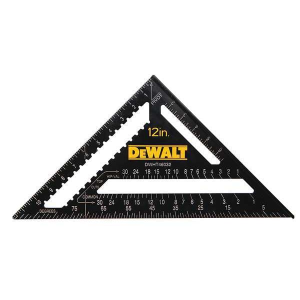 The DEWALT DWHT46032 Rafter Square is a measuring and marking tool designed for use with saws and other layout tasks. Constructed from extruded aluminum, it features a square edge style and stamped-in contrasting graduations for clear readability during use.