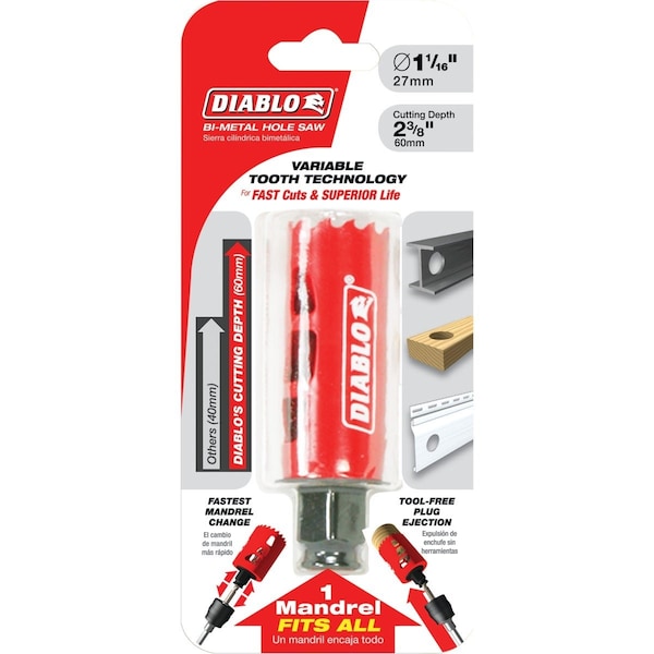 High performance hole saws deliver faster cutting performance and increased productivity. Hole saw design provides ultimate cutting depth to bore deeper holes in one pass Variable Tooth Design for faster cuts with less vibration and tool-free plug ejection for fast material removal. Snap-Lock offers quick and easy change system with no down time. One Snap-Lock mandrel fits all Diablo hole saws from 5/8 In. to 6 In. diameter. For use with wood metal. Mandrel and pilot bit sold separately.