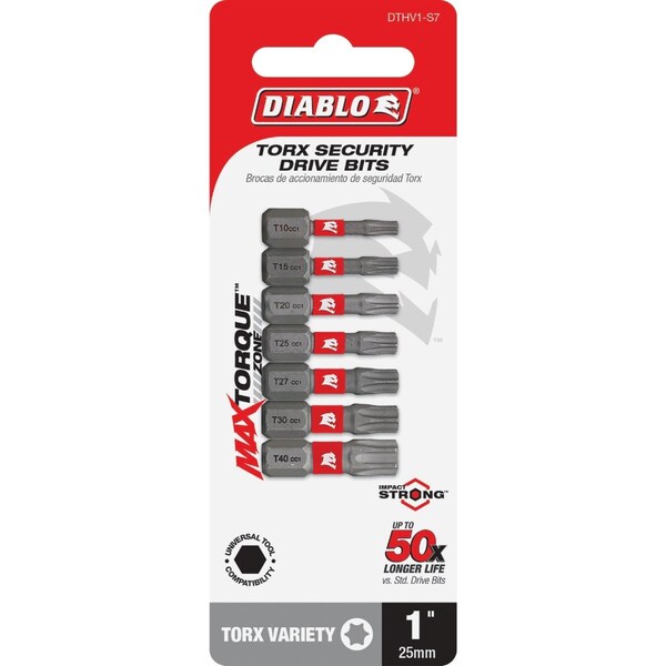 Diablos driver bit range of Torx bits delivers maximum performance extreme durability and up to 50x longer life when installing and removing fasteners. An optimized tip design provides a strong precise grip that reduces wear stripping and slippage. Optimized heat treatment process strengthens the bit for impact resistance and stability. Torque Resistant Design absorbs torque for less stress at the tip when tightening and removing nuts and screws. This range is Impact Strong delivering increased shank stability and durability in cordless and corded impact and drill drivers. Rust protection coating for superior wear and corrosion resistance. Laser engraved bit type and size for easy identification. Assorted pack includes seven Torx drive bits: No,10 No,15 No,20 No,25 No,27 No,30 and No,40.
