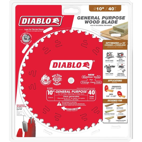 Diablos general purpose saw blade is ideal for cutting oak pine plywood pressure treated lumber and beams. An excellent choice for table & miter saws Diablos blade leaves a smooth cut in a variety of applications reducing the need to change blades between tasks. Use it for rip cuts with a smoother finish than dedicated ripping blades or make quality crosscuts in solid wood or plywood. Great for both sliding and chop style miter saws as well as table saws.