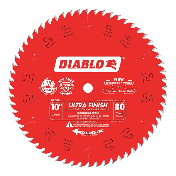 Circular Saw Blade, Blade Dia. 10 in, Max. Blade Speed 6,000 RPM, Arbor Size 5/8 in, Arbor Shape Round, Diamond Knockout Diamond Knockout Not Included, Number of Teeth 80, Max. Cutting Depth 4 in, Primary Material Application Wood, Materials Cut Wood, Metal Cutting Type Not Applicable, Wood Cutting Type Finishing, Cut Width 0.1 in, Tip Material Carbide, Hook Angle 15 Degrees , Tooth Grind ATB, For Use With Saw Type Miter Saws, Radial Arm Saws, Table Saws, Blade Type Finishing