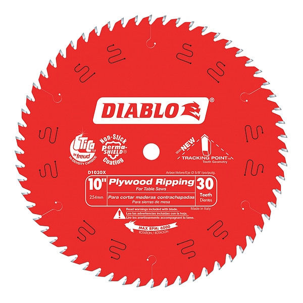 Circular Saw Blade, Blade Dia. 10 in, Max. Blade Speed 5,800 RPM, Arbor Size 5/8 in, Arbor Shape Round, Diamond Knockout Diamond Knockout Not Included, Number of Teeth 30, Max. Cutting Depth 2 in, Primary Material Application Wood, Materials Cut Plywood, Wood, Metal Cutting Type Not Applicable, Cut Width 0.1 in, Tip Material Carbide, Hook Angle 15 Degrees , Tooth Grind ATB, For Use With Saw Type Miter Saws, Radial Arm Saws, Table Saws, Blade Type Ripping, Plate Thickness 0.075 in
