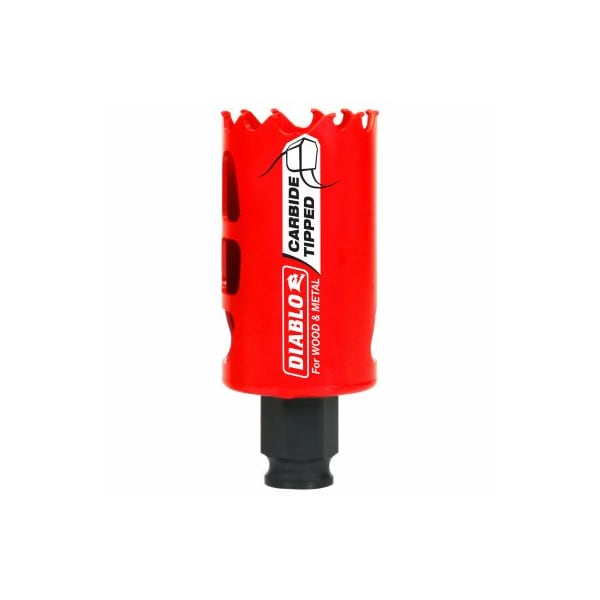 Diablo, 112, Carbide Tipped Hole Saw, Cuts Both Wood Metal, Use On Wood, Nail Embedded Wood, Plastic, Aluminum, Metal, Cast Iron, Metal Stainless Steel, Delivers Longer Cutting Life Than BiMetal For Faster Cutting Performance Increased Productivity, 238 Cutting Depth For 40 Percent Deeper Holes In Single Pass Increased Productivity, Variable Tooth Design For Faster Cuts, Snap Lock Plus Mandrel System For Quick Easy Changes With No Down Time, Includes Mandrel, Pilot Bit, 58 Threaded Adapter Fits Diameters 114 To 6 12 Threaded Adapter Fits Diameters 916 To 3116, 1 Size Fits All Mandrel Fits All Diablo Holes Saws In The Carbide BiMetal Range, From 58 To 6 Diameter, Tool Free Plug Ejection For Fast Material Removal