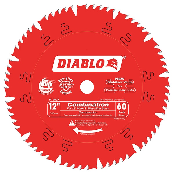 Circular Saw Blade, Blade Dia. 12 in, Max. Blade Speed 6,000 RPM, Arbor Size 1 in, Arbor Shape Round, Diamond Knockout Diamond Knockout Not Included, Number of Teeth 60, Max. Cutting Depth 4 in, Primary Material Application Wood, Materials Cut Plywood, Wood, Metal Cutting Type Not Applicable, Wood Cutting Type Combination, Cut Width 0.12 in, Tip Material Carbide, Hook Angle 15 Degrees , Tooth Grind COMB, For Use With Saw Type Miter Saws, Radial Arm Saws, Table Saws, Blade Type Combination