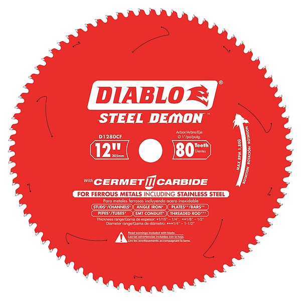 Circular Saw Blade, Series Steel Demon, Blade Dia. 12 in, Max. Blade Speed 1,800 RPM, Arbor Size 1 in, Arbor Shape Round, Diamond Knockout Diamond Knockout Not Included, Number of Teeth 80, Max. Cutting Depth 2 in, Primary Material Application Stainless Steel, Materials Cut Ferrous Metals, Stainless Steel, Steel, Metal Cutting Type Thin Metal, Wood Cutting Type Not Applicable, Cut Width 0.08 in, Tip Material Cermet, Hook Angle 0 Degrees , Tooth Grind TCG, For Use With Saw Type Metal Cutting Saws