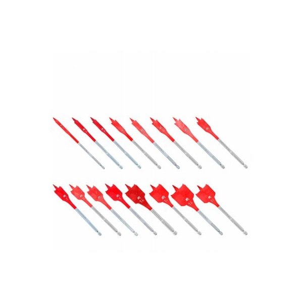 Diablo, 16 piece Speed Demon spade bit set Set consists of 1 each 14, 516, 38, 716, 12, 916, 58, 1116, 34, 1316, 78, 1, 118, 114, 138 and 112 spade bits Diablo's Speed Demon spade bit range provides one of the fastest, most effortless hole drilling solutions on the market for fast, clean wood The highperformance speedtip design selffeeds for faster hole making when compared to traditional spade bits An optimized curved paddle design enhances the chip evacuation process for more holes per charge This range is impact strong for increased shank stability and durability in cordless and corded impact and drill drivers