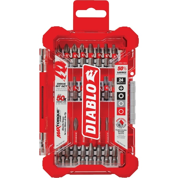 Diablos hi-performance screw driving set delivers extreme durability and longer life in the installation and removal of fasteners. The included drive bits have an optimized tip design to provide a strong precise grip that reduces wear stripping and slippage. The magnetic nut setters and drive bit holder are designed with a high-strength permanent magnet for a secure anti-wobble grip when fastening screws and nuts. Torque Resistant Design absorbs torque for less stress at the tip. Rust protection coating for superior wear and corrosion resistance. Laser engraved for easy identification. Optimized heat treatment process strengthens the nut setter for impact resistance and stability. This set is Impact Strong delivering increased shank stability and durability in cordless and corded impact and drill drivers. Includes (1) 1 in. No,1 Phillips Drive Bit (2) 1 in. and (2) 2 in. No,2 Phillips Drive Bits (1) 1 in. No,2 Phillips Reduced for Drywall Screws Drive Bit (1) 1 in. No,3 Phillips Drive Bit (1) 1 in. No,1 Square Drive Bit (1) 1 in. and (1) 2 in. No,2 Square Drive Bits (1) 1 in. No,3 Square Drive Bit (1) 1 in. No,10 Torx Drive Bit (1) 1 in. and (1) 2 in. No,15 Torx Drive Bits (2) 1 in. and (2) 2 in. No,20 Torx Drive Bits (2) 1 in. and (1) 2 in. No,25 Torx Drive Bits (1) 1 in. No,30 Torx Drive Bit (1) 1 in. No,40 Torx Drive Bit (1) 2-3/8 in. Magnetic Drive Bit Holder.