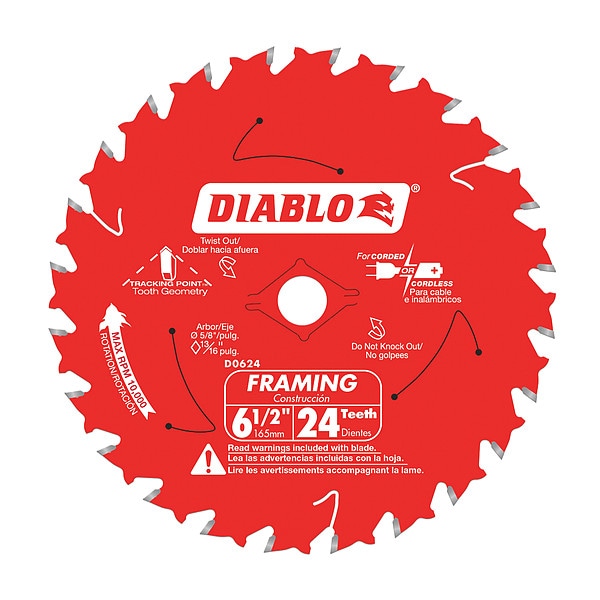 Circular Saw Blade, Blade Dia. 6 1/2 in, Max. Blade Speed 10,000 RPM, Arbor Size 5/8 in, Arbor Shape Round, Diamond Knockout Diamond Knockout Included, Number of Teeth 24, Max. Cutting Depth 2 3/16 in, Primary Material Application Wood, Materials Cut Wood, Metal Cutting Type Not Applicable, Wood Cutting Type Combination, Cut Width 0.06 in, Tip Material Carbide, Hook Angle 18 Degrees , Tooth Grind ATB, For Use With Saw Type Circular Saws, Blade Type Combination, Plate Thickness 0.039 in