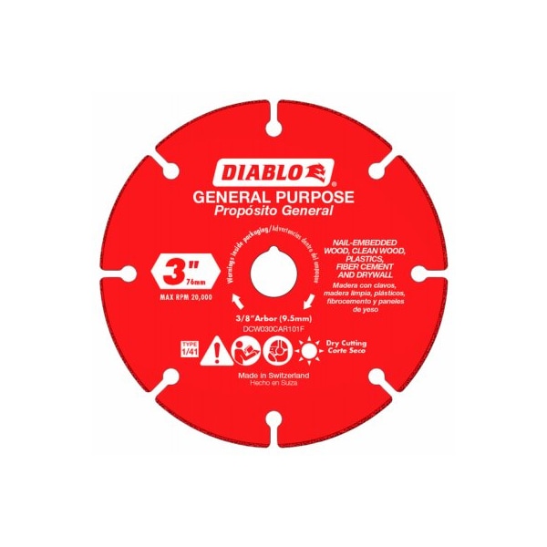 Diablo 3 In Carbide Grit CutOff Wheel For MultiMaterials Diablo's Carbide Grit MultiMaterial CutOff Wheels Features Innovative Cutting Technology For Superior Performance In A Wide Range Of Applications These CutOff Wheels Feature A Reinforced Steel Body For A Consistent Diameter When Cutting Woods, Plastics, Fiber Cement Or Drywall The Wheel's Advanced Laser Melting Process Provides A Longer Lasting And Durable Carbide Edge Bond For Maximum Durability And Longer Cutting Life