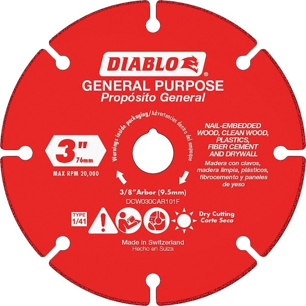 Diablos carbide grit multi-material cut-off wheels features innovative cutting technology for superior performance in a wide range of applications. These cut-off wheels feature a reinforced steel body for a consistent diameter when cutting woods plastics fiber cement or drywall. The wheels advanced laser melting process provides a longer lasting and durable carbide edge bond for maximum durability and longer cutting life. Optimized for 3 in. compact saws from manufactures such as: Milwaukee (3/8 arbor; 20000 RPM) Ryobi (3/8 arbor; 19000 RPM) and Ridgid (3/8 arbor 19500 RPM).