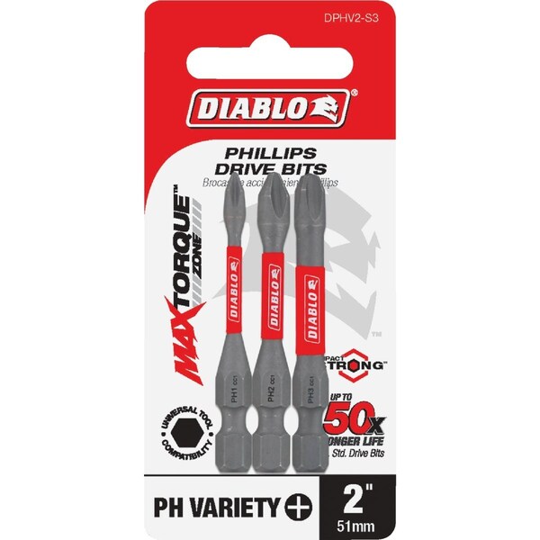 Diablos driver bit range of Phillips bits delivers maximum performance extreme durability and up to 50x longer life when installing and removing fasteners. An optimized tip design provides a strong precise grip that reduces wear stripping and slippage. Torque Resistant Design absorbs torque for less stress at the tip when tightening and removing nuts and screws. This range is Impact Strong delivering increased shank stability and durability in cordless and corded impact and drill drivers. Set includes: No,1 No,2 and No,3 Phillips drive bits.