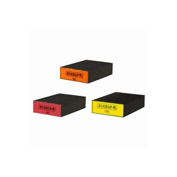 Diablo 3 pack of assorted flat edge sanding block Flat edge sanding blocks are tear resistant against splinters and nail or screw ends Diablo's sanding blocks are used for drywall and wood All diablo sanding blocks have a unique color code to determine grit needed The assorted blocks and color codes are red for coarse grit, orange for medium grit, yellow for fine grit, green for super fine grit and blue for ultra fine grit