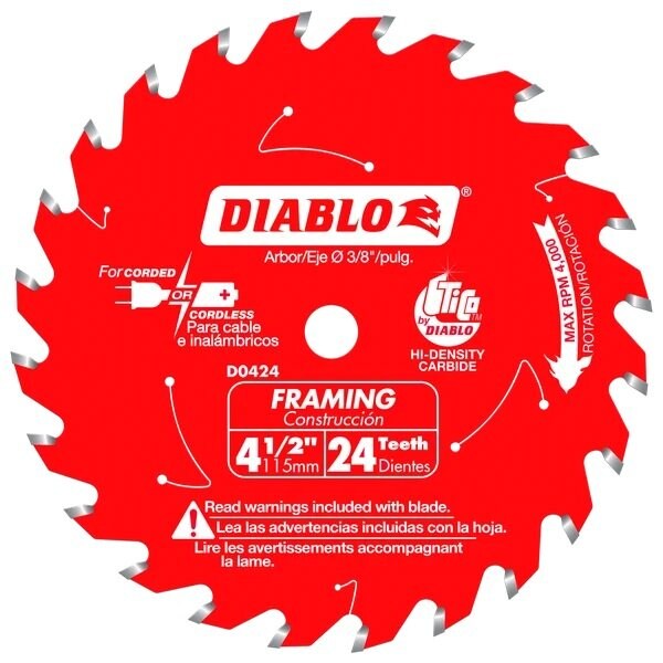 Diablo's innovative Framing Saw Blade for Wood is ideal for general construction applications, including fast, efficient ripping and crosscutting. Diablo's blade cuts rough framing lumber, high quality finish lumber, plywood, OSB, and hardboard siding with the smoothest, fastest and most accurate cut. The thin kerf design requires less cutting power from the user and the saw for better control over the cut. Diablos unique design, extra-tough steel plate and proprietary carbide tips deliver longer blade life and frames more houses than standard blades on the market.