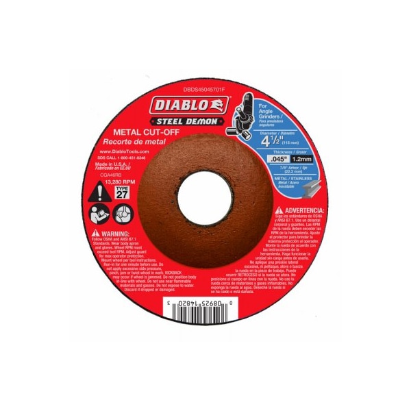 Diablo Steel Demon 412 In Type 27 Metal Cut Off Disc Diablo's Steel Demon Metal Cut Off Discs Deliver Industrial Performance, Increased Productivity And Longer Cutting Life Featuring A Premium Ceramic Blend That Produces Quick Cuts That Deliver Up To 6X Longer Life A Fully Reinforced Depressed Center Enables The Disc To Withstand HeavyDuty Metal Applications Such As Heavy Stock Removal Or Blending These Discs Are Ideal For Flush Cuts And Working In HardToReach Areas