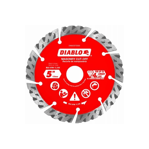 Diablo, 5 diamond segmented turbo cutoff discs for masonry Diablo's diamond segmented turbo rim masonry cutoff discs provide extreme durability, faster cuts and longer life in concrete, concrete with rebar, brick and cinder block These diamond rimmed discs deliver up to 30 percent faster cuts versus standard diamond cutoff discs The disc's industrialgrade diamonds with hardened disc body delivers lasting durability and maximizes cutting quality in hardened materials even in extreme applications