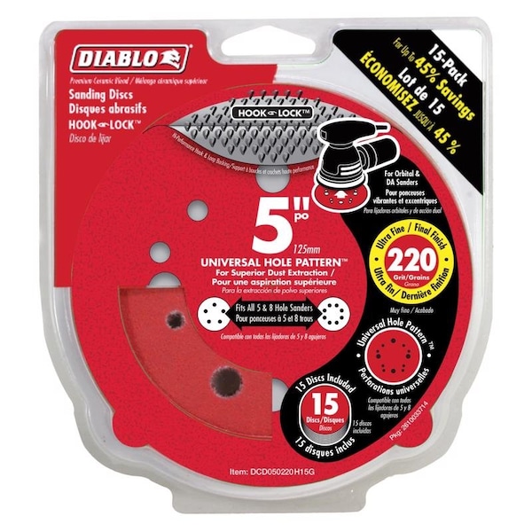 Diablo's premium 5 in. 220-Grit universal, 12-hole random orbital sanding (ROS) discs with Hook & Lock backing include break-through innovations that improve performance, extend sanding life and increase productivity. Featuring a premium ceramic blend, these discs remove material faster than other sanding discs and offer an extra long sanding life. Clog-Shield, Diablo's own blend of grinding agents, reduces loading thus maximizing productivity. The superior grain bonding system, Endura Bond, provides Diablo's sanding discs with longer life and extreme durability.