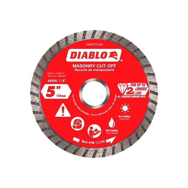 Diablo's diamond turbo masonry cut-off discs provide extreme durability and longer life in concrete, brick and cinder block applications. These continuous rimmed diamond discs deliver up to 2X longer cutting life versus standard diamond cut-off discs. The disc's industrial-grade diamonds coupled with a hardened disc body delivers lasting durability and maximizes cutting quality in hardened materials even in extreme applications.