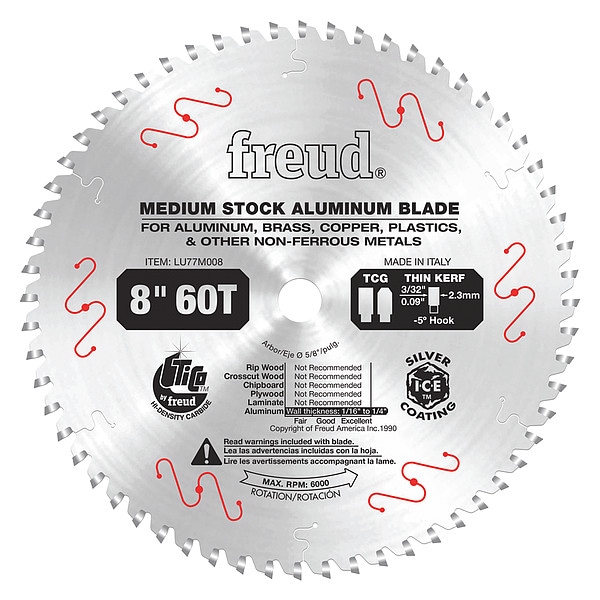 Circular Saw Blade, Blade Dia. 8 in, Max. Blade Speed 7,000 RPM, Arbor Size 5/8 in, Arbor Shape Round, Diamond Knockout Diamond Knockout Included, Number of Teeth 60, Max. Cutting Depth 1/4 in, Primary Material Application Aluminum, Soft Metals, Materials Cut Aluminum, Non-Ferrous Metals, Metal Cutting Type Thin Metal, Wood Cutting Type Not Applicable, Cut Width 0.08 in, Tip Material Carbide, Hook Angle 5 Degrees , Tooth Grind TCG, For Use With Saw Type Circular Saws