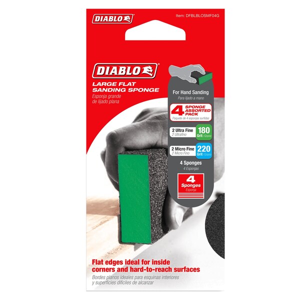 Diablo's premium flat edge sanding sponges include breakthrough innovations for superior sanding performance, extended sanding life and increased hand-sanding productivity. Featuring a premium aluminum oxide blend, these flat sanding sponges remove material faster and offer up to 3X longer sanding life versus standard hand sanding sheets. The flat edges make it easy to access inside corners and hard to reach surfaces and the longer length allow for sanding medium surface areas. The full contact design provides maximum sanding potential by delivering consistent scratch patterns and ultra-smooth finishes. The superior grain bonding system, ENDURA-BOND, provides Diablo's sanding blocks with longer life and extreme durability.