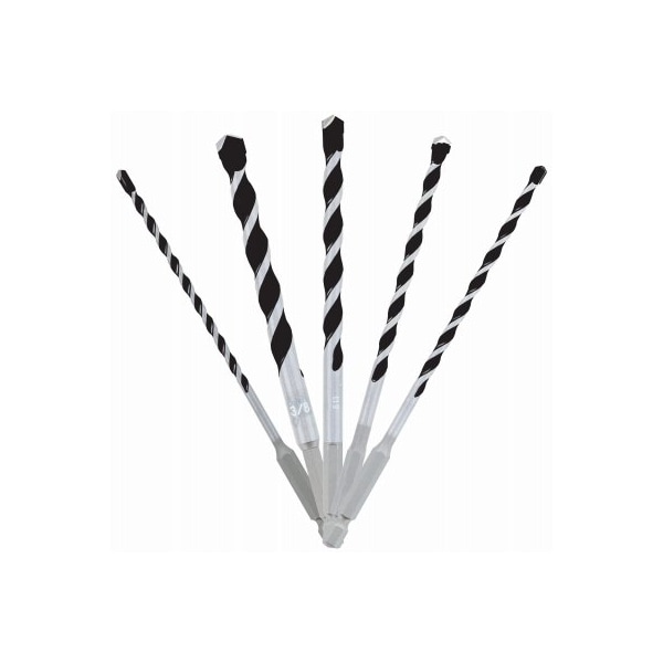 Diablo, 5 piece multimaterial carbide tipped hammer drill bit set Set consists of 532 x 4 x 6, 316 x 4 x 6, 14 x 4 x 6, 516 x 4 x 6 and 38 x 4 x 6 hammer drill bits Diablo's multimaterial carbide tipped hammer drill bit range provides faster starts and longer life in tile, masonry, concrete, wood and metal Optimized with a unique brazing and hardening process, the carbide tip extends life and productivity, allowing users to drill faster holes The multiground grip point tip design allows for aggressive starts that produce clean, fast holes in a variety of applications This range is impact strong for increased shank stability and durability in cordless and corded impact and drill drivers