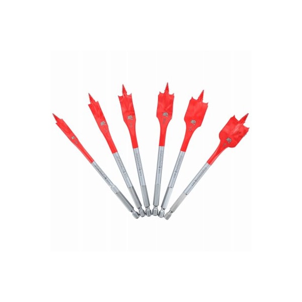 Diablo, 6 piece Speed Demon spade bit set Set consists of 1 each 38, 12, 58, 34, 78 and 1 spade bits Diablo's Speed Demon spade bit range provides one of the fastest, most effortless hole drilling solutions on the market for fast, clean wood The highperformance speedtip design selffeeds for faster hole making when compared to traditional spade bits An optimized curved paddle design enhances the chip evacuation process for more holes per charge This range is impact strong for increased shank stability and durability in cordless and corded impact and drill drivers