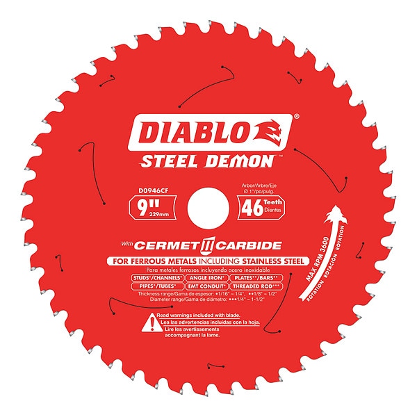 Circular Saw Blade, Blade Dia. 9 in, Max. Blade Speed 3,600 RPM, Arbor Size 1 in, Arbor Shape Round, Diamond Knockout Diamond Knockout Not Included, Number of Teeth 46, Max. Cutting Depth 3 1/2 in, Primary Material Application Stainless Steel, Materials Cut Ferrous Metals, Stainless Steel, Steel, Wood Cutting Type Not Applicable, Cut Width 0.08 in, Tip Material Cermet, Hook Angle 0 Degrees , Tooth Grind TCG, For Use With Saw Type Metal Cutting Saws, Blade Type Stainless Steel Cutting