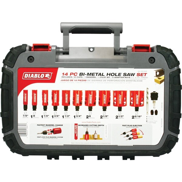 Diablo 14-piece hole saw kit features 10 bi-metal hole saw cups and 4-piece Snap-Lock Plus mandrel system for quick and easy hole saw changes for maximum job performance. These new hole saws provide ultimate cutting length of 2-3/8 In. to bore deeper holes in a single pass. Features Variable Tooth Design for faster cuts. Universal Snap-Lock Plus mandrel system fits all hole saws in the range including carbide tipped hole saws. Tool-free plug ejection for fast material removal. For use with wood and metal. Sizes include: 7/8 In. 1 In. 1-1/8 In. 1-3/8 In. 1-1/2 In. 1-3/4 In. 2 In. 2-1/8 In. 2-1/2 In. 2-9/16 In. Snap-Lock Plus mandrel pilot bit adapter nuts.