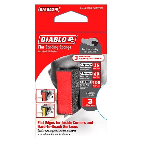 Diablo's premium flat edge sanding sponges include break-through innovations for superior sanding performance, extended sanding life and increased hand-sanding productivity. Featuring a premium aluminum oxide blend, these flat sanding sponges remove material faster and offer up to 3X longer sanding life versus standard hand sanding sheets. The flat edges make it easy to access inside corners and hard to reach surfaces. The full contact design provides maximum sanding potential by delivering consistent scratch patterns and ultra-smooth finishes. The superior grain bonding system, Endura-Bond, provides Diablo's sanding blocks with longer life and extreme durability.