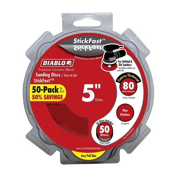 Diablo's premium 5 in. 80-Grit random orbital sanding (ROS) discs with StickFast backing include break-through innovations that improve performance, extend sanding life and increase productivity. Featuring a premium ceramic blend, these discs remove material faster than other sanding discs and offer an extra long sanding life. Clog-Shield, Diablo's own blend of grinding agents, reduces loading thus maximizing productivity. The superior grain bonding system, Endura-Bond, provides Diablo's sanding discs with longer life and extreme durability.