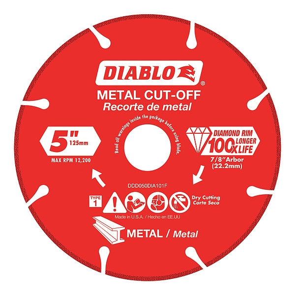 Diamond Saw Blade, DIA101F Series, Blade Dia. 5 in, Arbor Size 7/8 in, Arbor Shape Round, Max. Blade Speed 12,200 RPM, For Use With Saw Type Angle Grinders, Circular Saws, Cutting Type Wet/Dry, Rim Type Segmented, Max. Cutting Depth 1 1/2 in, Materials Cut Metal, Grade Better, Cut Width 1.2 in, Blade Material Steel