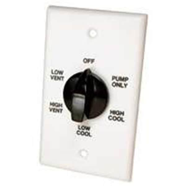 6 position rotary wall switch for 2-speed evaporative coolers. Kits include plastic plate, mounting screws and wiring diagram. Ul recognized component rotary switch. Rated for 1/3 to 3/4 h.p. Motors.