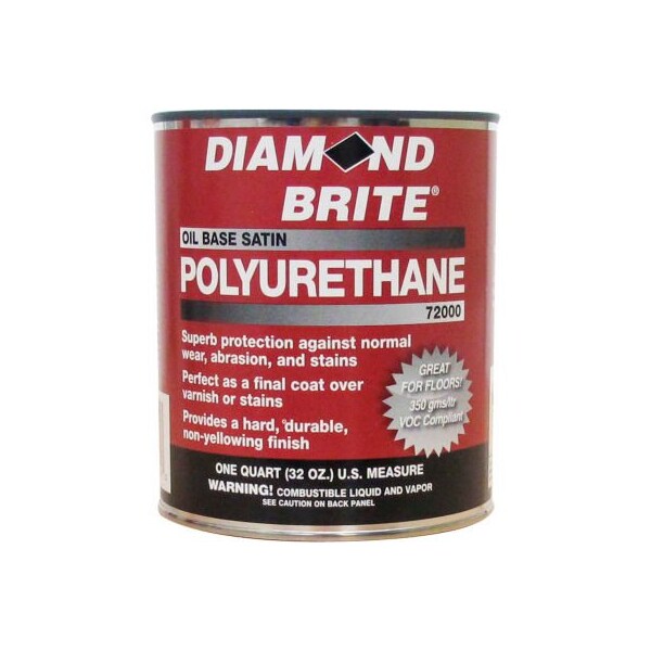 Diamond brite paint oil satin polyurethane, 32 oz. Pail - 72000-4 polyurethane is an ultra clear/hard durable finish formulated to protect interior wood surfaces from nicks, scratches, spills and stains. This easy-to-apply polyurethane enhances the natural wood grain with a beautiful, clear finish. Interior polyurethane is primarily for interior and protected exterior wood surfaces including floors, doors, furniture and cabinets. Coverage is approximately 500 sq. Feet/gal. Depending upon surface porosity. Use on bare, stained or previously varnished or finished wood. This product has 6-8 hour drying time (not recommended to use on hot/humid days). Has superior durability, and protects against spills and stains. 6-8 hr dry time; 24 hr recoat time. Mineral spirits clean-up. Protect from freezing.