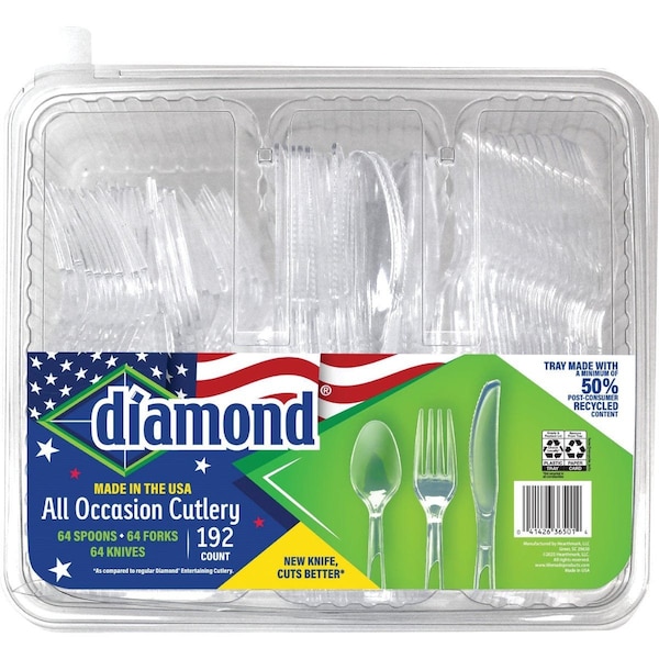 Clear full length cutlery comes in a reusable plastic caddy tray with lid. Contains: 64 forks 64 spoons and 64 knives.