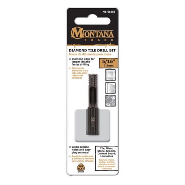 Features Sub Brand: Montana Material: Black Oxide Shank Type: Tri-Flat Product Type: Drill Bit Drill Bit Diameter: 5/16 in. Application: Porcelain Number of Pieces: 1 Diameter: 5/16 in. Size: 5/16 in Usage: Black Oxide Drill Bit Product Name: Black Oxide Specifications Diemension: 6.4 H x 2.25 W x 1.3 L Weight: 0.1 lbs