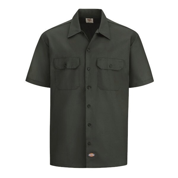 Shirt, Gender Men's, Style Work Shirt, Material Cotton/Polyester, Fabric Weight 5.25 oz/sq yd, Front Closure Type Buttons, Number of Outside Pockets 2, Fit Generous Fit, Color Green, Sleeve Type Short, Sleeve Length 10 5/8 in, Size L, Minimum Neck Size 16 in, Maximum Neck Size 16 1/2 in, Maximum Chest Size 44 in, Minimum Chest Size 42 in, Length 31 1/2 in, Size-Body Type Regular, Button Material Melamine, Cleaning and Care Instructions Machine Wash, Moisture-Wicking Yes