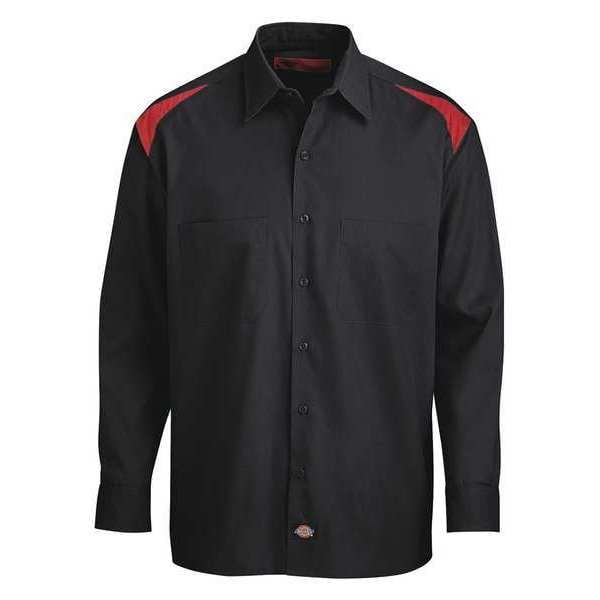 Long Sleeve Shirt, Gender Men's, Material 35 Percent Cotton, 65 Percent Polyester, Fabric Weight 4.6 oz, Front Closure Type Buttons, Number of Outside Pockets 2, Fit Generous Fit, Color Black/Red, Sleeve Type Long, Sleeve Length 34 in, Size L, Minimum Neck Size 16 in, Maximum Neck Size 16 1/2 in, Maximum Chest Size 24 3/4 in, Length Regular, Application Managers, Mechanics, Service Providers, Technicians, Cleaning and Care Instructions Home Wash, Industrial Laundry, Collar Style Banded