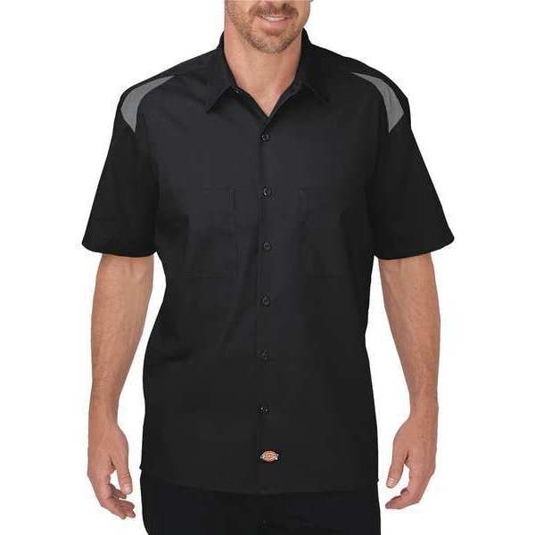 Short Sleeve Shirt, Gender Men's, Material 35 Percent Cotton, 65 Percent Polyester, Fabric Weight 4.6 oz, Front Closure Type Buttons, Number of Outside Pockets 2, Fit Spacious Fit, Color Black/Gray, Sleeve Type Short, Size M, Minimum Neck Size 15 in, Maximum Neck Size 15 1/2 in, Maximum Chest Size 23 1/4 in, Length Regular, Application Managers, Mechanics, Service Providers, Technicians, Cleaning and Care Instructions Home Wash, Industrial Laundry, Collar Style Banded