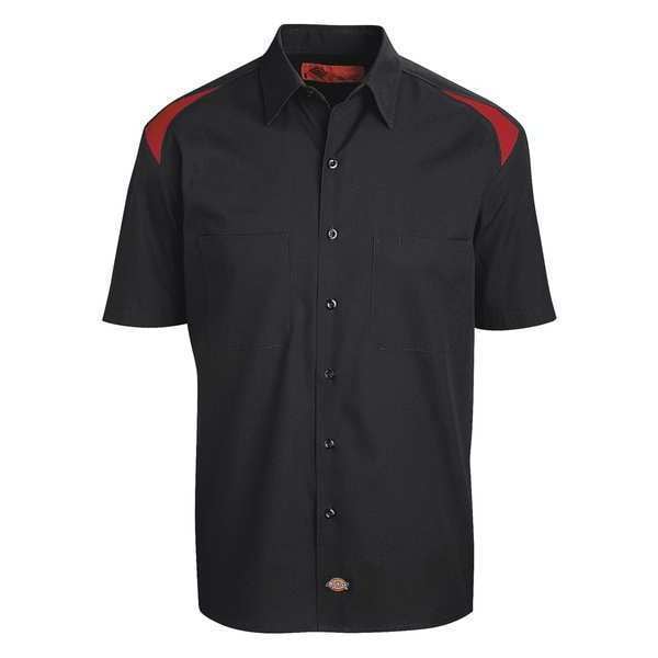 Short Sleeve Shirt, Gender Men's, Material 35 Percent Cotton, 65 Percent Polyester, Fabric Weight 4.6 oz, Front Closure Type Buttons, Number of Outside Pockets 2, Fit Spacious Fit, Color Black/Red, Sleeve Type Short, Size L, Minimum Neck Size 16 in, Maximum Neck Size 16 1/2 in, Maximum Chest Size 24 3/4 in, Length Regular, Application Managers, Mechanics, Service Providers, Technicians, Cleaning and Care Instructions Home Wash, Industrial Laundry, Collar Style Banded