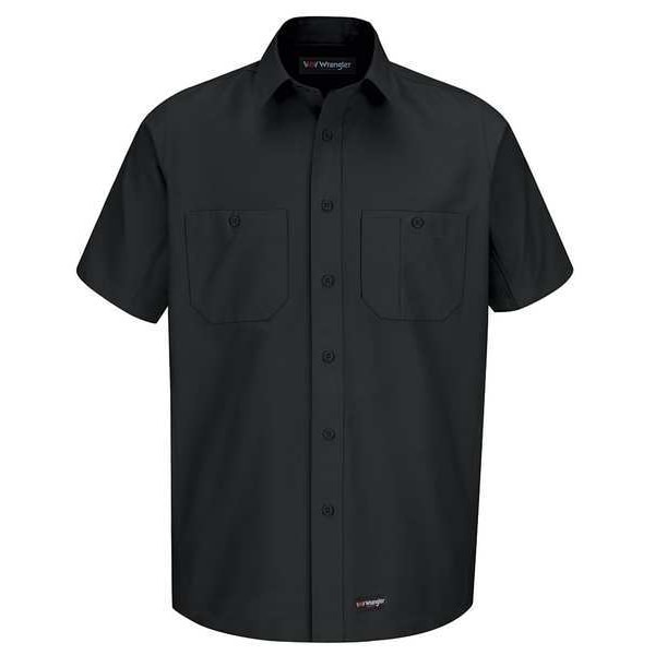 Short Sleeve Shirt, Gender Men's, Style Dress, Material 40 Percent Polyester, 60 Percent Cotton, Fabric Weight 5.25 oz, Front Closure Type Buttons, Number of Outside Pockets 2, Color Black, Sleeve Type Short, Sleeve Length 35 in, Size L, Maximum Neck Size 16 in, Maximum Chest Size 52 in, Length 31 in, Cleaning and Care Instructions Home Wash, Industrial Laundry, Collar Style Banded, Features Color Retention, Full Seamless Underarm Gusset, Soil Release, Wickable, Wrinkle Resistance