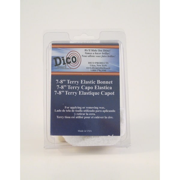8 inch terry cloth bonnet for applying or removing wax use with random orbital polishing machines or backing pads washable and reusable terry cloth clamshell package. Washable and reusable.